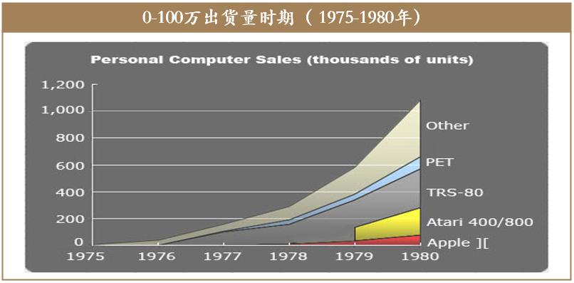 1946年代第一台计算机发明,但由于价格高昂,一般家庭和商业用户难以负担。但以Altair、Apple2为标志,售价更低&Killer APP捆绑销售的形式彻底激活了市场,整体市场从30-40万台年出货跃升到百万。