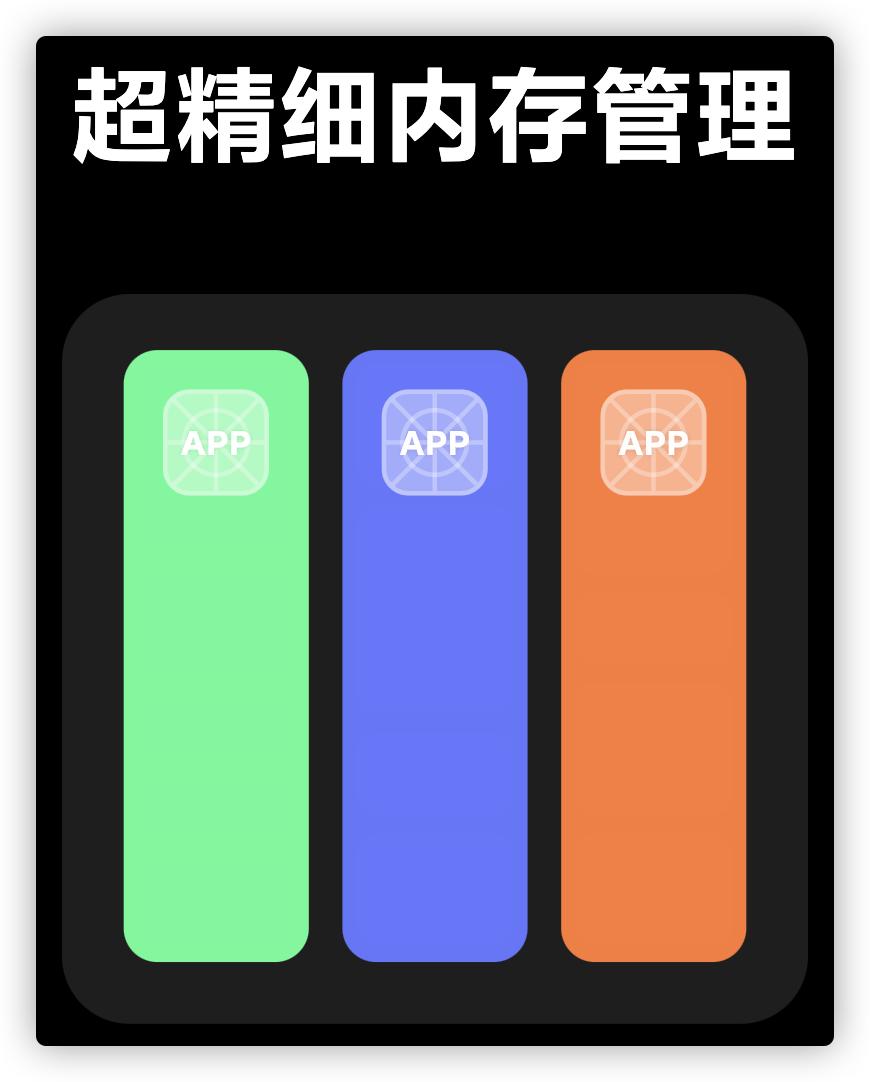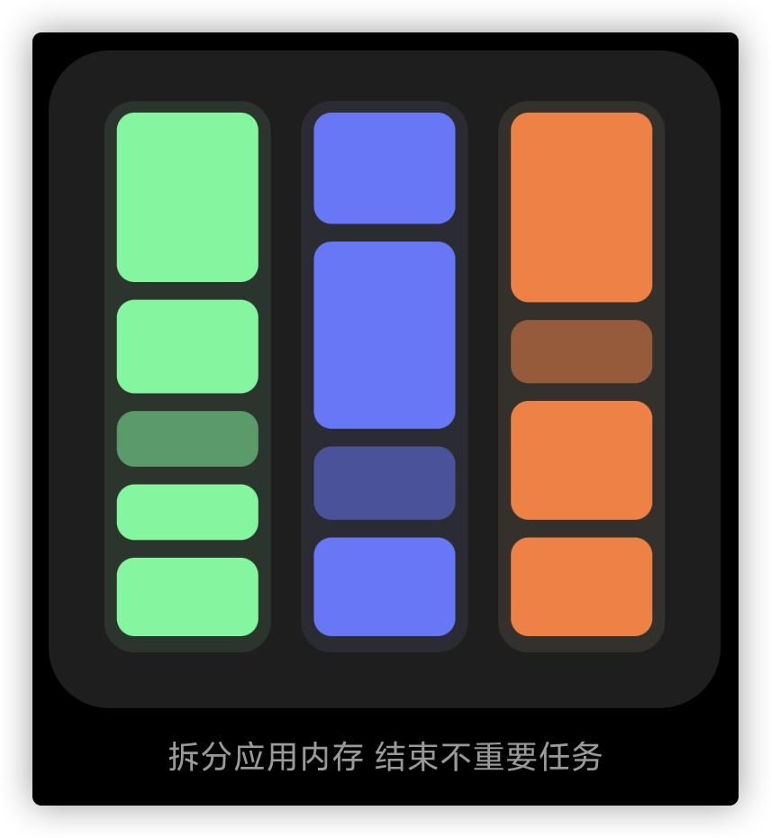 然后,第二步是拆分应用内存,结束不重要的任务,刚才还是整块的内存占用现在在逻辑上被划分为了大小不等(即不同功能占用内存大小不同)的几块。这一步其实就是核心了,如何来划分呢?按什么维度划分呢?有没有可能划分失误反而影响用户体验呢?我们后面来聊。