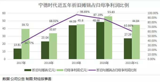 1、宁德时代利润和收入上涨不成比例,是因为严格的折旧标准导致的折旧摊销费用侵蚀了利润,另外资产减值也对净利润造成了影响。