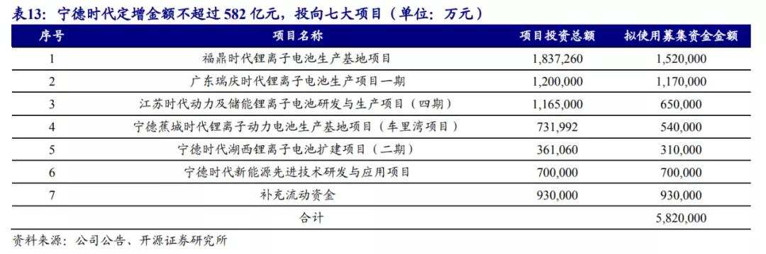 2020年7月底,宁德就进行过一次197亿元的定向增发,资金用途为宁德时代湖西锂离子电池扩建项目,江苏时代动力及储能锂离子电池研发与生产项目(三期),四川时代动力电池项目一期,电化学储能前沿技术储备研发项目和补充流动资金。