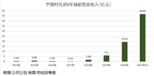电化学储能从 0~1~N 发展,有望成为宁德第二条“增长引擎”。宁德时代储能业务从2014年的0.44亿增长到2021年H1的46.93亿,8年增长了100多倍。宁德时代在储能方面做了充分的技术储备。