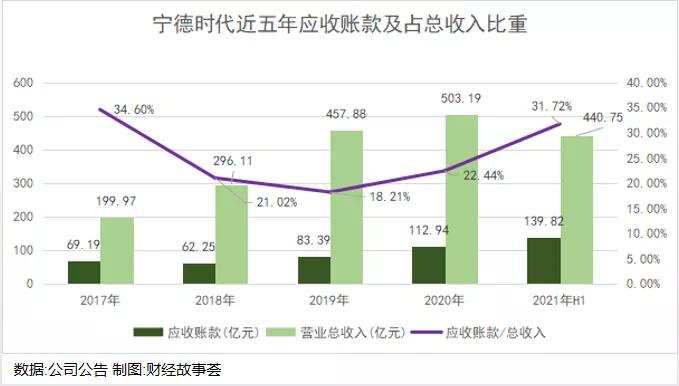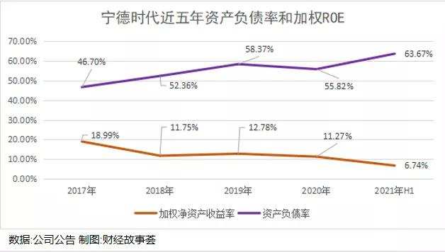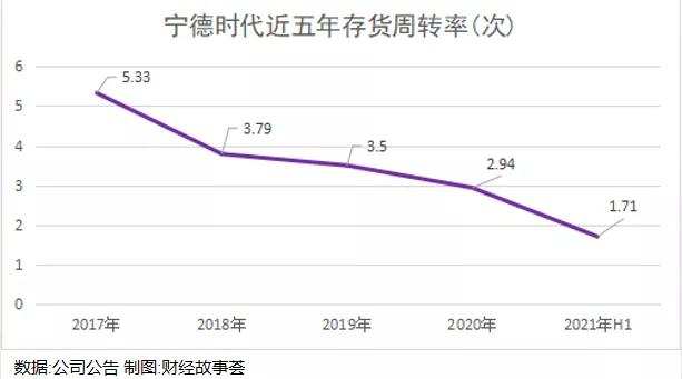 从2017年开始,宁德时代的存货周转率就持续下降,从2017年的5.33下降到2021年H1的1.71。
