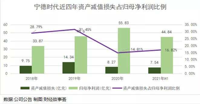 还有一个重要因素,就是每年宁德时代提取了较高的资产减值,根据上市后的年报披露,2018年到2021年上半年,公司的资产减值损失分别是9.75亿、14.34亿、8.27亿和7.54亿,占据归母净利润的比例分别是28.79%、31.45%、14.81%和16.82%。
