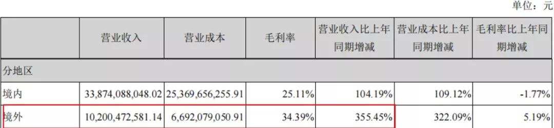 根据中报披露,境外业务大幅增长,2021H1境内营收 338.74 亿元,同比增加104.2%;境外营收102.00亿元,同比大涨355.4%;境外营收占比达 23.1%,同比增加11.2%。