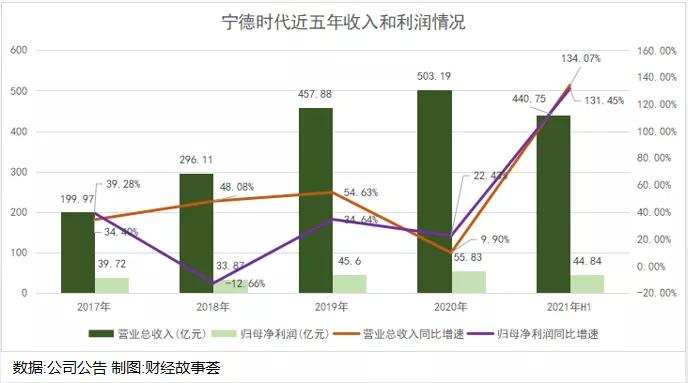 从中报可以看出,宁德时代的收入处于加速放量的过程中。2017年,总收入只有199.97亿,而2021年上半年的收入就已经达到440.75亿,是2017年的2.2倍,接近2019年全年总收入的96.26%。