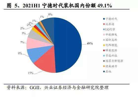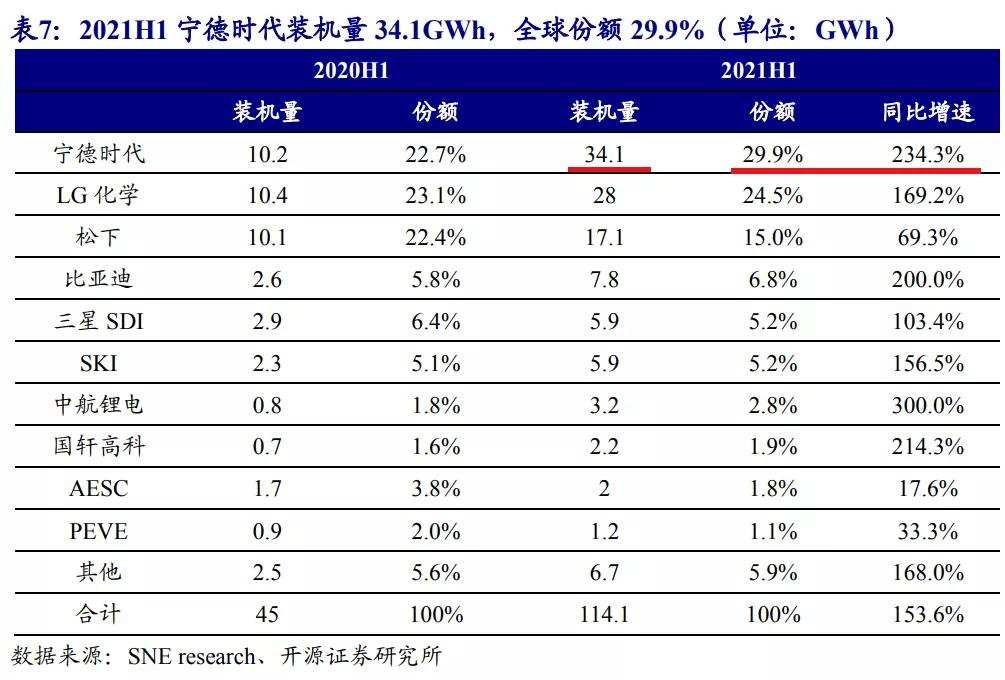 境外业务量的大涨,让宁德时代登顶全球龙头。根据 SNE research 数据,2021年1-6 月,全球动力电池使用量为114.1GWh,同比增长155.1%,其中,全球前十动力电池企业使用量占比为91.3%,2021H1宁德时代全球车用动力电池装机量34.1GWh,同比增加234.3%;全球市场份额29.9%,排名第一。