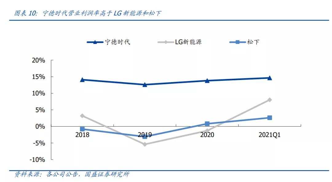 即便如此,宁德时代营业利润率仍远超LG新能源和松下。2021Q1,宁德时代、LG新能源、松下的营业利润率分别为14.6%、8.0%、2.6%。这是因为中国锂电产业集群已经相当成熟,具有低成本的材料供应链。另外,公司在全球动力电池厂商中兼具技术和成本优势,有望保持长期强有力的竞争力。
