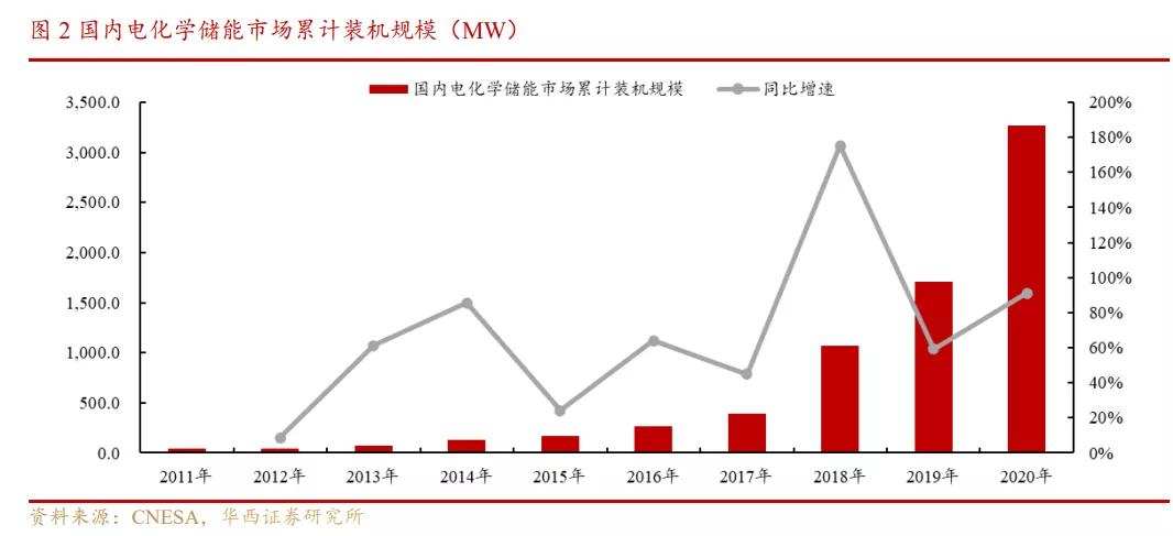 2021年7月15日,国家发展改革委、国家能源局联合印发了《关于加快推动新型储能发展的指导意见》,文件明确指出,到2025年,实现新型储能从商业化初期向规模化发展转变,装机规模达3000万千瓦以上。截止2020年底,国内电化学储能的累计装机规模为3.27GW,本次政策有望推动国内新型储能装机大幅提升。
