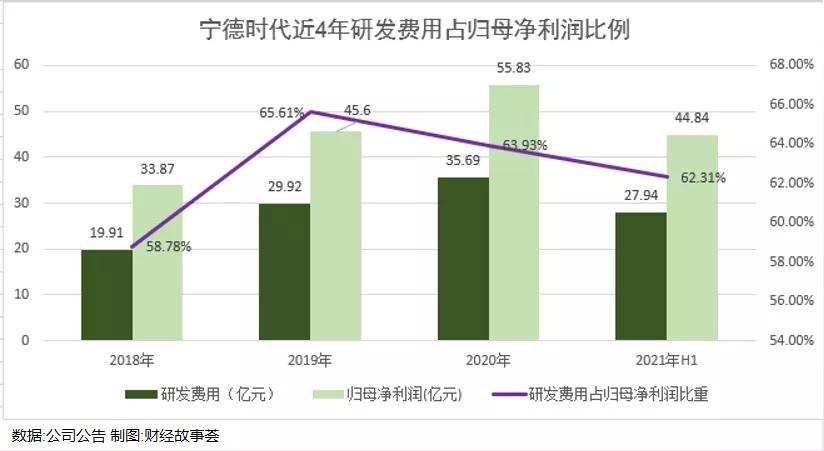 另外,宁德时代每年的研发支出全部费用化,直接从净利润里扣除,这笔支出不菲,2018年到2021年上半年分别占据归母净利润的58.78%,65.61%,63.93%,62.31%。