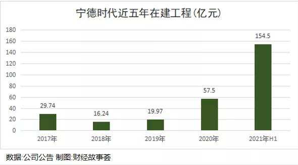 根据中报披露,目前宁德时代的产能利用率已经达到92.2%,为了缓解产能压力,公司自然是大规模建厂,2021上半年公司产能65.45GWh,在建产能92.50GWh。2021 年上半年公司在建工程为154.5亿元,同比去年增加350.4%,主要系为公司新增产能增加投资。公司在建工程从2018年起保持逐年递增趋势,如公司计划新增产能可以顺利投产,预计营业收入有望延续高增长。