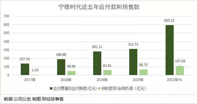 宁德时代的应付票据及应付账款(亿元)连年增长,2021年H1高达595.21亿,预收款(2019之前名称)/合同负债(2020年之后名称)在2021年H1 高达107.59亿。这说明宁德时代在产业链中话语权很强,利用自己的优势大量占用了上游供货商的资金。