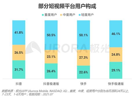 主流短视频平台普遍有较强的娱乐属性,相当一部分视频内容比较简单,观众不需要动脑思考,被动“看热闹”即可。甚至有些内容只是简单的动作配上劲爆的音乐,就图一个“闹着玩儿”。短视频凭着形象生动的特点,很自然的吸引了观众尤其是青少年的注意力,但如果受众长期沉迷于娱乐内容而影响到正常的学习、工作和生活,将会对其身心健康产生不利影响。即便是知识性的视频内容,青少年过度观看也会影响到其他方面如沟通社交能力的发展。目前,多个短视频平台已经上线青少年模式,防止青少年沉迷观看。据极光数据,今年7月,抖音和快手极速版的重度占比达30%左右。