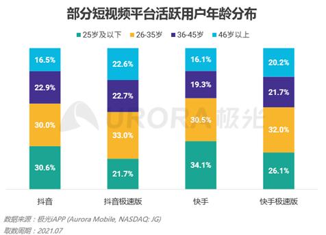 互联网技术层面的迅猛发展使内容端实现了从文字到图文再到视频的进化。短视频被广泛利用到了科普、教育、社交以及网络购物等诸多领域,简短的篇幅和形象生动的表现形式使信息的传播更加直观高效,受到各个年龄层受众的欢迎。据极光数据,今年7月,抖音和快手25岁及以下活跃用户占比均超30%,抖音极速版和快手极速版46岁及以上活跃用户占比均超20%。