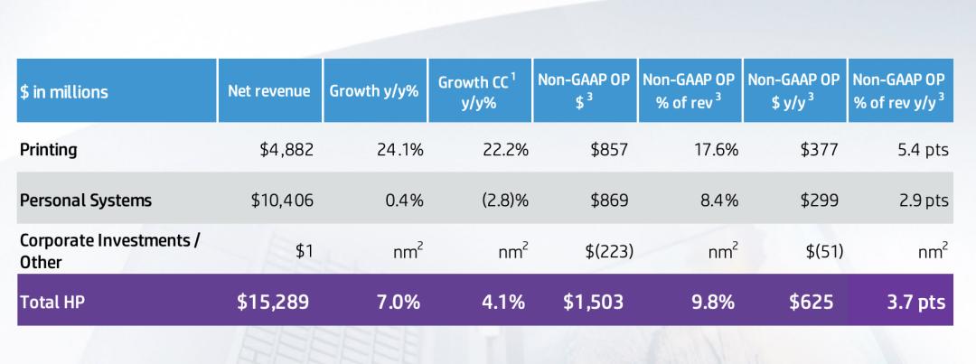 惠普两大业务支柱分别是个人系统(Personal System)和打印机业务(Printing),在汇报财季中,个人系统(包括台式机、笔记本、工作站等)贡献了68%的营收收入,104.06亿美元,年增长为0.4%,实现8.69亿的营业利润,营业利润率为8.4%,提高了2.9个百分点。