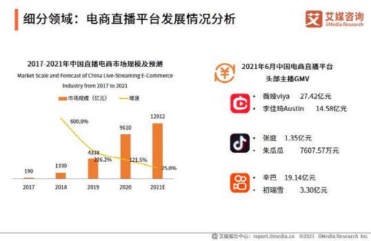 根据艾媒咨询上周发布的《2021年上半年中国在线直播行业发展专题研究报告》显示,2021年中国直播电商市场规模预计达12012亿元。