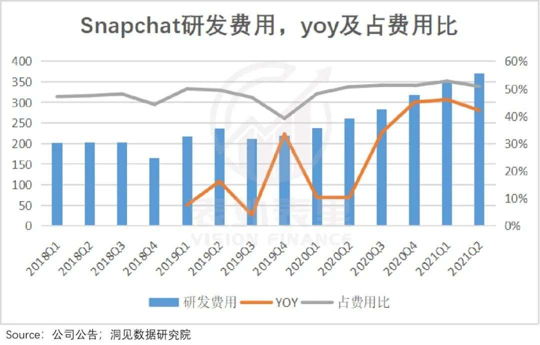 如下图,Snap的研发费用一直稳定增加,且从2019Q1开始,研发费用占比大部分时候都维持50%左右。