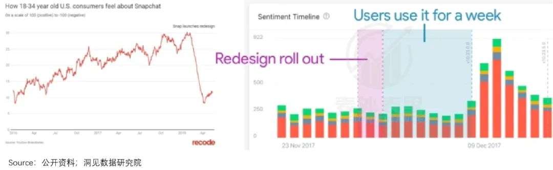 但在Facebook步步紧逼,模仿抄袭的竞争压力下,Snap的DAU增长不可避免地受到冲击。而上马改版策略应敌,又因忽视用户体验,表现惨烈。