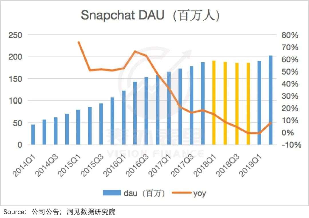 如下图,2018Q1-Q4之后,Snap的DAU不仅没如预期那样增长,反而出现环比下滑。
