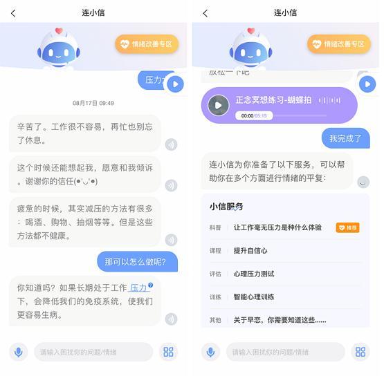 早在2018年,连信科技就开始围绕数字化、智能化心理服务应用技术进行深入研发,并推出了AI心理健康服务机器人连小信(Psybot),彼时这一市场还未有企业正式推出同类产品。“连小信”综合嵌入了AI心理教育、AI心理评估、AI心理训练、AI心理咨询四大核心功能系统,可在智能化、数字化、私密化、普惠化的基础上为用户提供一站式身心健康管理的陪伴服务。