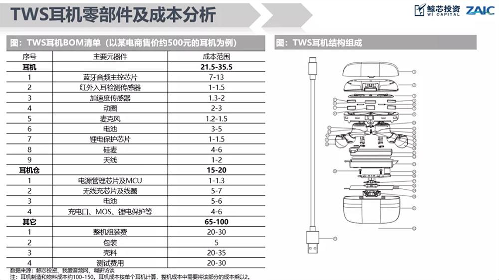 ▲TWS耳机零部件及成本分析(来源:鲸芯投资)