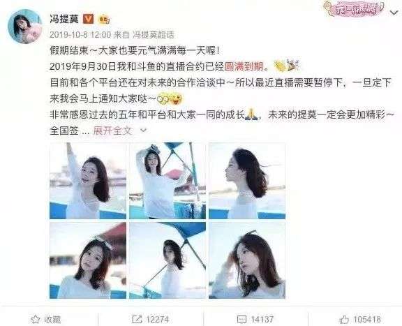 冯提莫与斗鱼合约到期时发微博