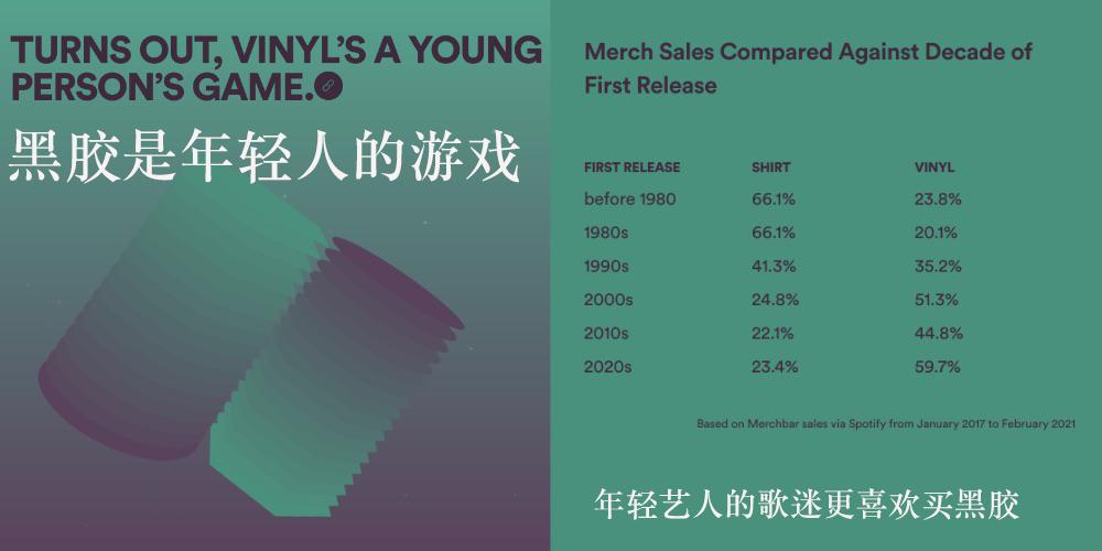 不久前,Spotify发布了一个报告,报告中,把黑胶和CD都列入了“周边”的品类。据Spotify的统计,2017年至今,黑胶已经成为Spotify用户最喜欢的周边产品。