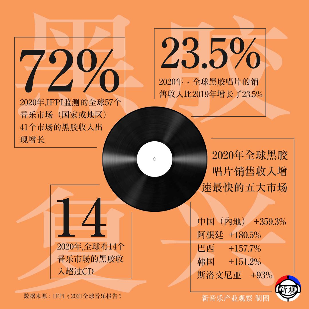 国际唱片业协会IFPI今年4月发布的《2021全球音乐报告》显示,2020年,该报告所监测的全球57个音乐市场(国家或地区),41个市场的黑胶收入出现增长。其中,有14个市场的黑胶唱片收入已经超过CD。