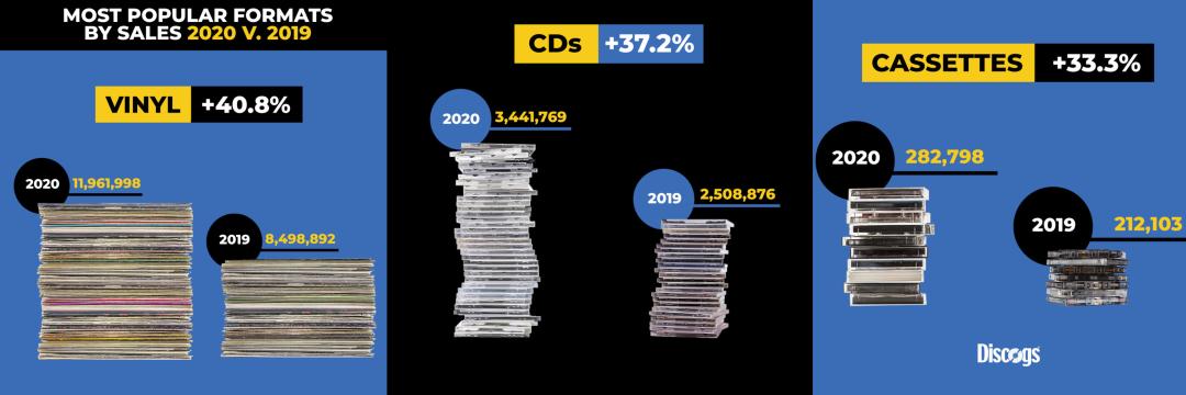 实体唱片收藏平台Discogs发布的数据也显示,实体唱片市场交易越发活跃,2020年该平台上卖出的黑胶、CD和磁带数量都较2019年有大幅增长。