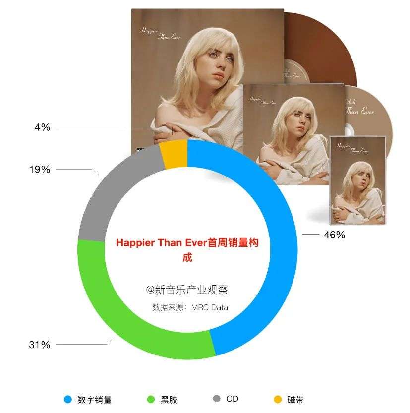 MRC Data的数据显示,Billie Eilish早前发行的专辑《Happier Than Ever》,首周销量23.8万中,54%来自实体销售,其中,黑胶销量达到7.3万张,占总销量的31%,CD销量4.6万张,占总销量的19%,另外,磁带也卖出了约1万盒。