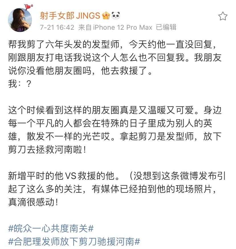 7月21日,微博用户“射手女郎JINGS”发布微博称,预约理发师剪发,但是没有得到回复,后来才知道他去郑州救援了,“身边每一个平凡的人都会在特殊的日子里成为别人的英雄……拿起剪刀是发型师,放下剪刀去拯救河南”。