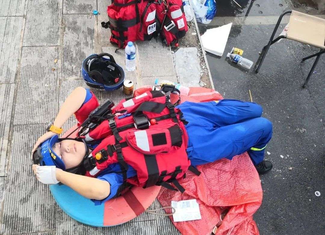 7月23日上午9点,合肥市蓝天救援队的15名队员从白沙镇撤离,进入新乡市展开救援。一直忙到晚上8点后,队员们又累又饿,体能严重下降。