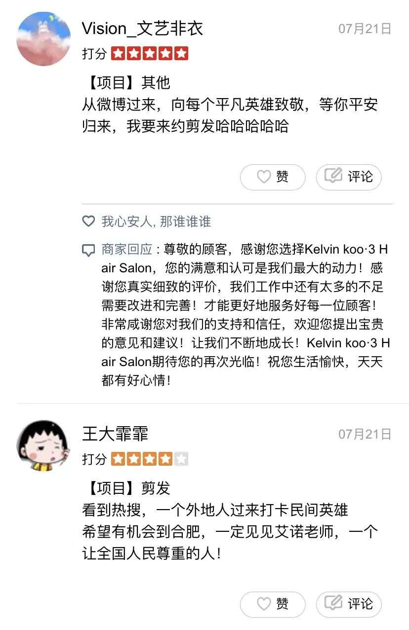 有人在美团上搜索“Kelvin koo·3”,这是余涛所在的理发店,在这里,他的名字叫“艾若”。最远的顾客是从福建过去的,顾客向他致敬,称赞他为“英雄”,还有顾客在美团上直截了当地评价:致敬!向艾若老师学习!
