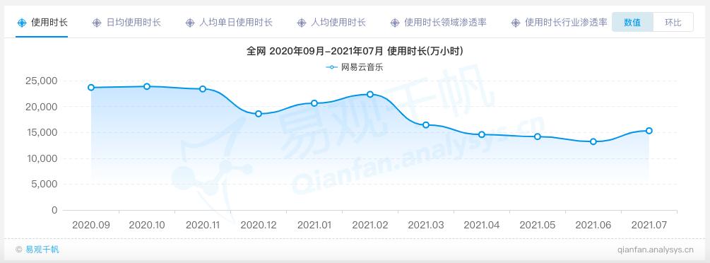 据易观千帆数据统计,从2020年9月份开始,网易云音乐的使用时长整体呈下降趋势,丰富的娱乐社交功能对于留存用户的作用并不如想象中美好。
