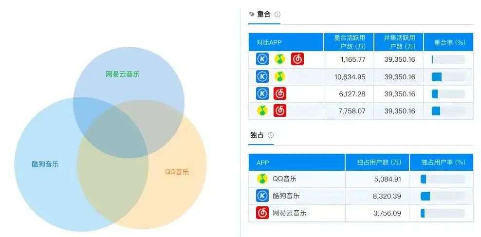 从产品层面来看,根据易观千帆数据,网易云音乐的在线用户时长持续走低,和QQ音乐、酷狗音乐的用户重合率也相对较高,独占用户率在三者中也是最少的。网易云音乐优势不算明显。