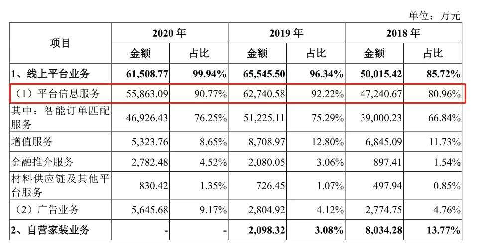 从收入来源来看,2020年土巴兔99.94%的收入来自线上平台业务,其中智能订单匹配服务(行业俗称的信息中介)占比76.25%;增值服务占比8.65%;金融推介服务占比4.52%;广告业务占比9.17%。