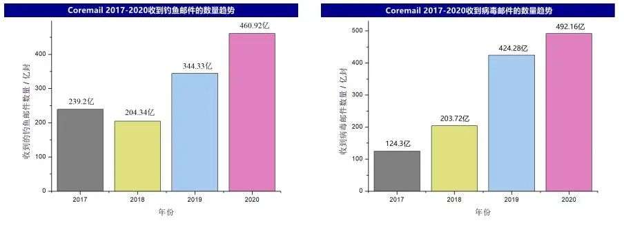 我们看到,邮件安全正面临着严峻的形势!根据Coremail论客与奇安信统计的2020年全国企业级邮箱用户收到钓鱼邮件、病毒邮件的监测数据: