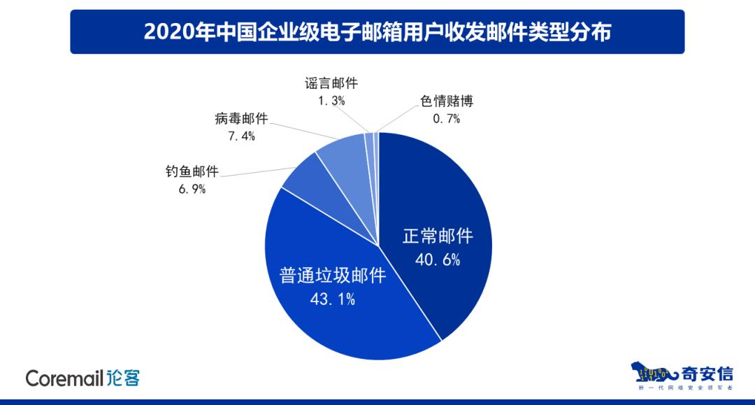 2020年共收到垃圾邮件约3,946.4亿封,约占企业级用户邮件收发总量的59.42%,其中包括病毒和钓鱼邮件,仅有4成为正常邮件。