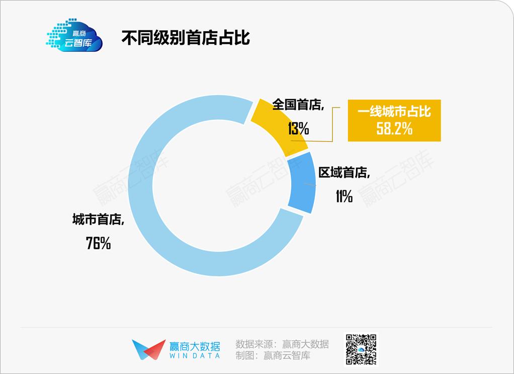 从首店级别来看,全国首店数量为98家,其中一线城市占比最高,为58.2%,以上海、广州的表现最为亮眼,分别为28和15家。二线城市宁波以12家的数量跑赢北京(6家)和深圳(8家)。