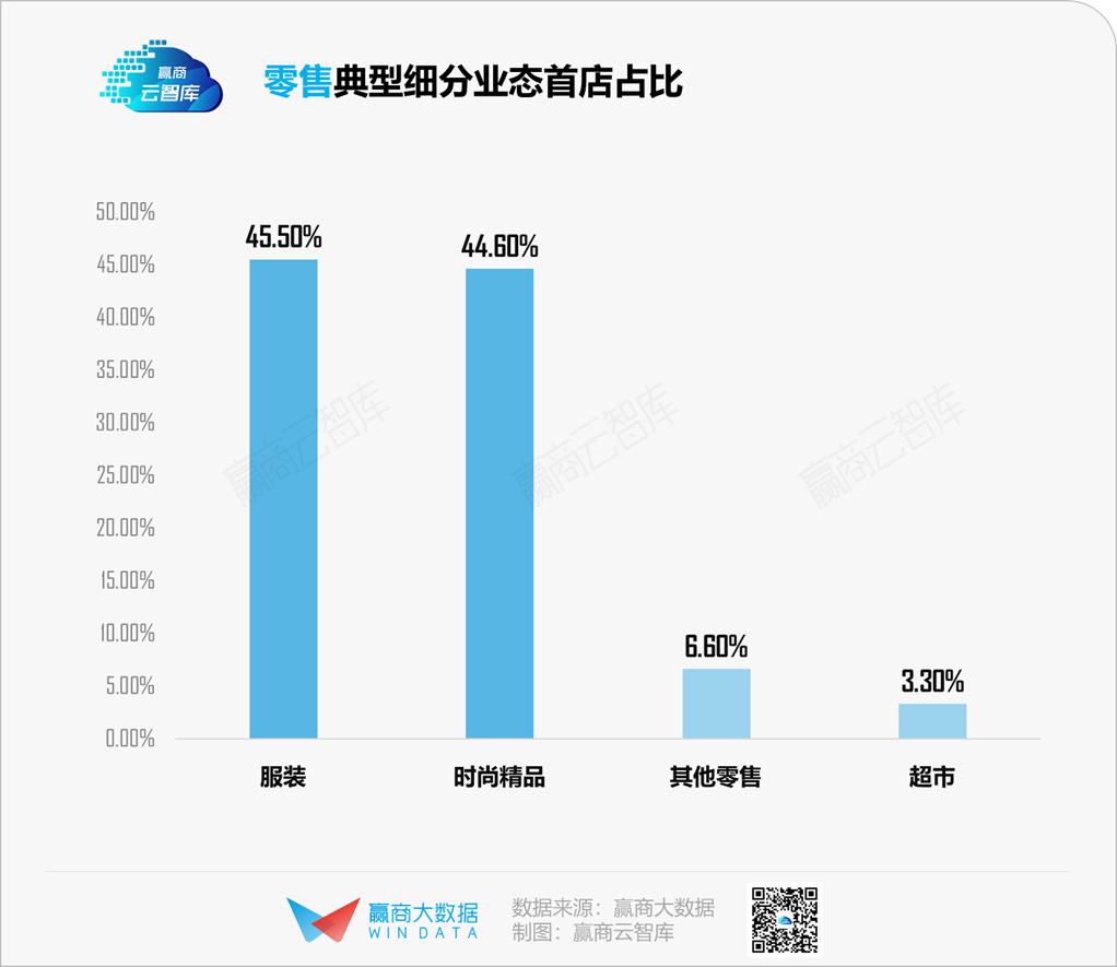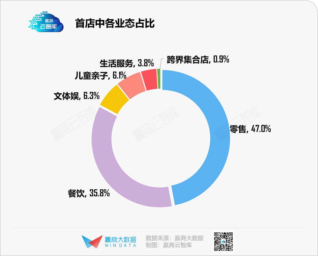 首店业态分布中,零售最为突出,餐饮其次,文体娱和儿童亲子的活力渐显,其分别占比47%、35.8%、6.3%和6.1%。