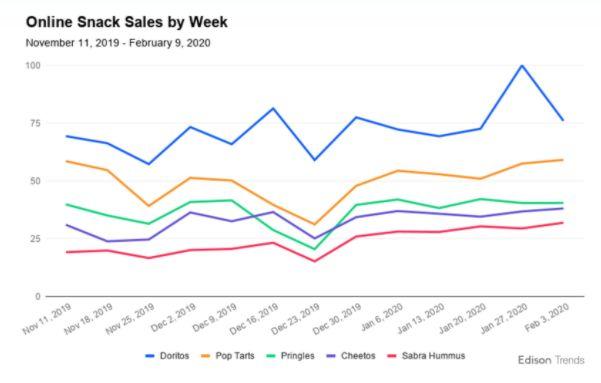 根据数据网站Edison Trends对沃尔玛,Costco,Target等连锁商超进行的统计分析,在超级碗比赛周,多力多滋常驻网购零食销量榜TOP1,并且总体销量比平日陡增4%-10%。