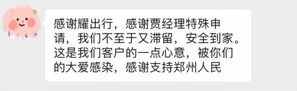 经过8个多小时风雨兼程、跋山涉水,当天晚上,所有客户都平安送达郑州。一路上,客户被耀出行管家们高超的驾驶技术和全程细心体贴的服务所感动,事后给耀出行西安管家团队送上了万元红包:“感谢耀出行,我们不至于又滞留,现已安全到家,被你们的大爱感染,感谢支持郑州人民!”