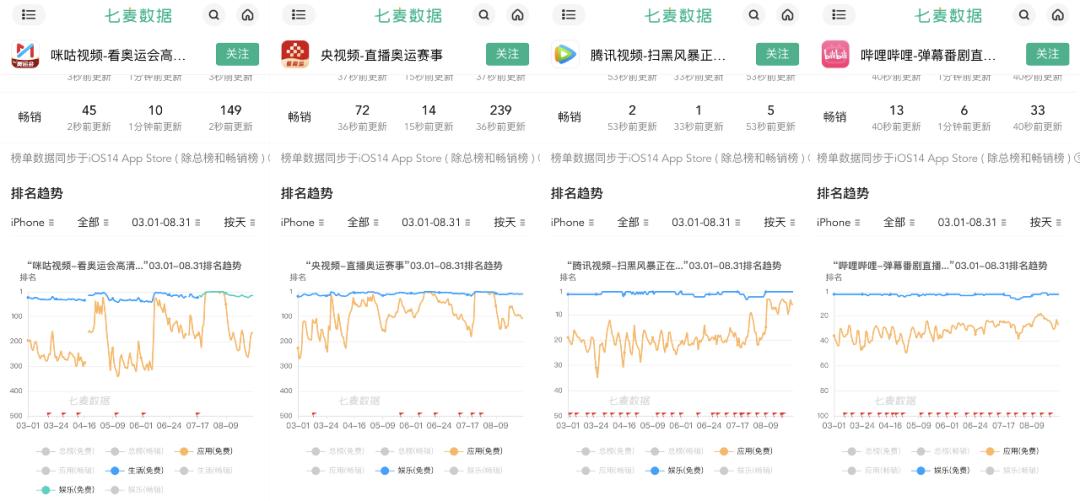 央视的官方流媒体平台“央视频”直接获得了这一批赛事内容,腾讯、快手、中国移动旗下咪咕视频则是通过央视授权。其中,咪咕视频拥有直播权益,腾讯和快手则只有视频点播和短视频权益。因此毫不意外,央视频与咪咕视频app在8月奥运期间下载量大增,跃进榜单前列。