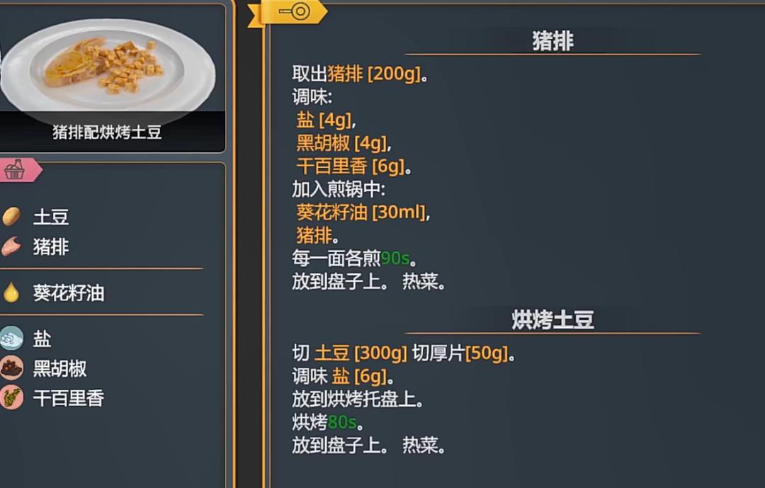以《Cooking Simulator》(《炒菜模拟器》)为例,玩家可以在游戏中模拟现实饭菜的制作全过程。在挑选食材、购买食用油,到处理食材(切菜、洗菜),再到炒菜(翻锅、放调味料、加食材)这几个步骤中,玩家需要考虑许小细节,比如:土豆应该切成什么形状、盐该放多少、菜应该炒多久等。即使是不会做菜的小白,也可以按照食谱上的步骤来尝试做一道饭菜。