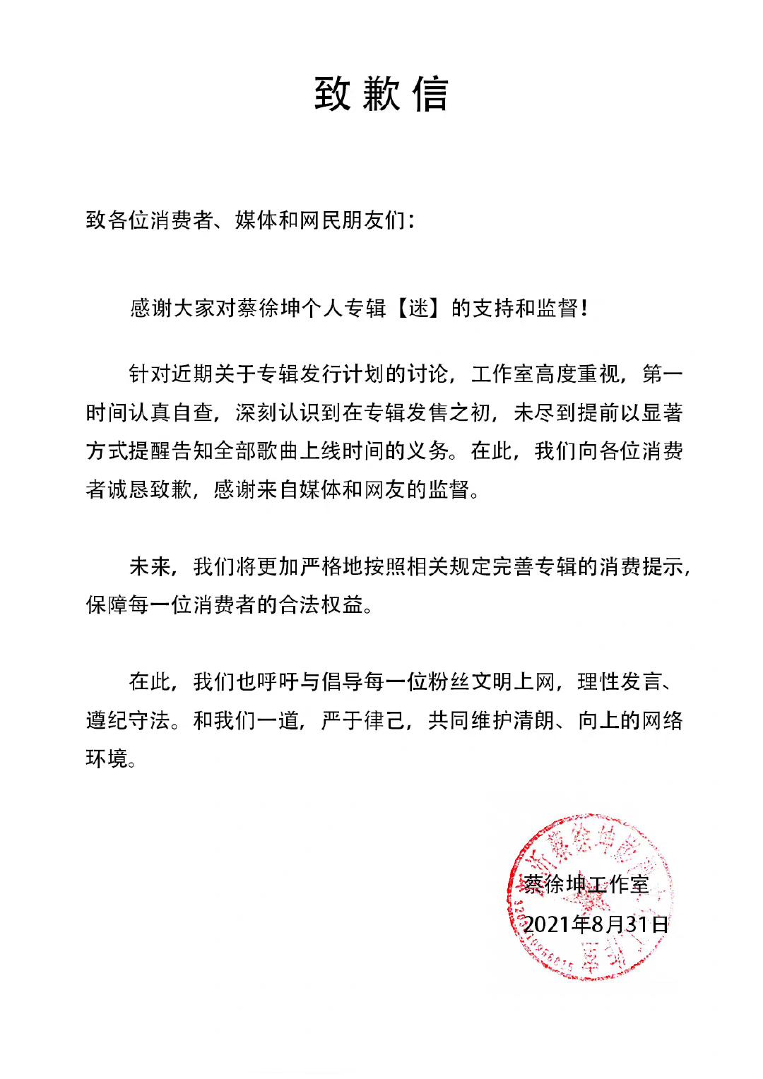 舆论持续发酵,8月30日,蔡徐坤对此事做出回应,《迷》专辑也紧急上线了五首作品,仅有最后一首《Outro》显示“即将上架”。随后,蔡徐坤工作室出面致歉。