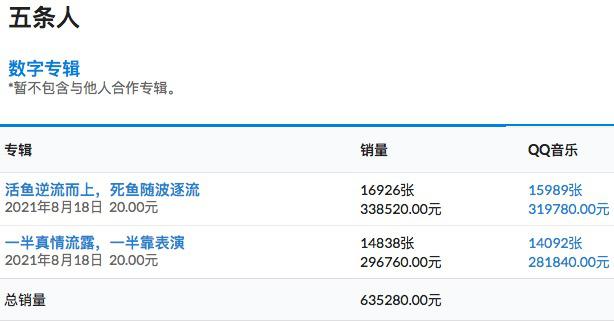 今年8月,五条人乐队也发布了数字双专辑《活鱼逆流而上,死鱼随波逐流》《一半真情流露,一半靠表演》,截至发稿前,前者售出超1.6万张,后者售出超1.4万张,二者销售额超过63万元,在独立乐队领域也已经是不错的成绩。毕竟除了头部音乐人及乐队之外,独立音乐罕现于付费数字专辑的形式。