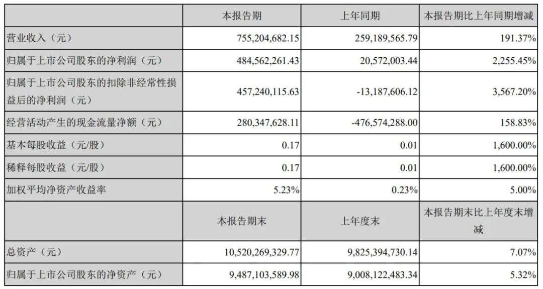 业绩:上半年营业收入7.55亿,较上年同期增长了191.37%,归属上市公司股东的净利润为4.85亿,较上年同期增长了2255.45%。