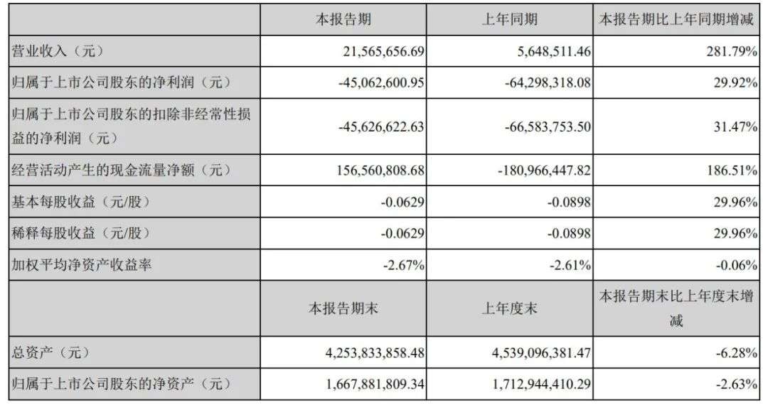 业绩:上半年营业收入2156万,较上年同期增长了281.79%,归属上市公司股东的净利润为-4506万,亏损比重较上年同期缩小了29.92%。