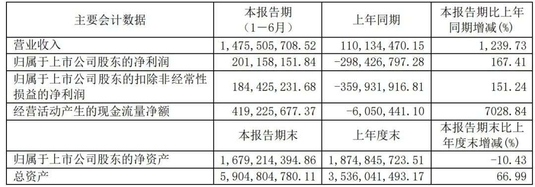 业绩:上半年营业收入14.75亿,较上年同期增长了1239.73%,归属上市公司股东的净利润为2.01亿,较上年同期增长了167.41%。