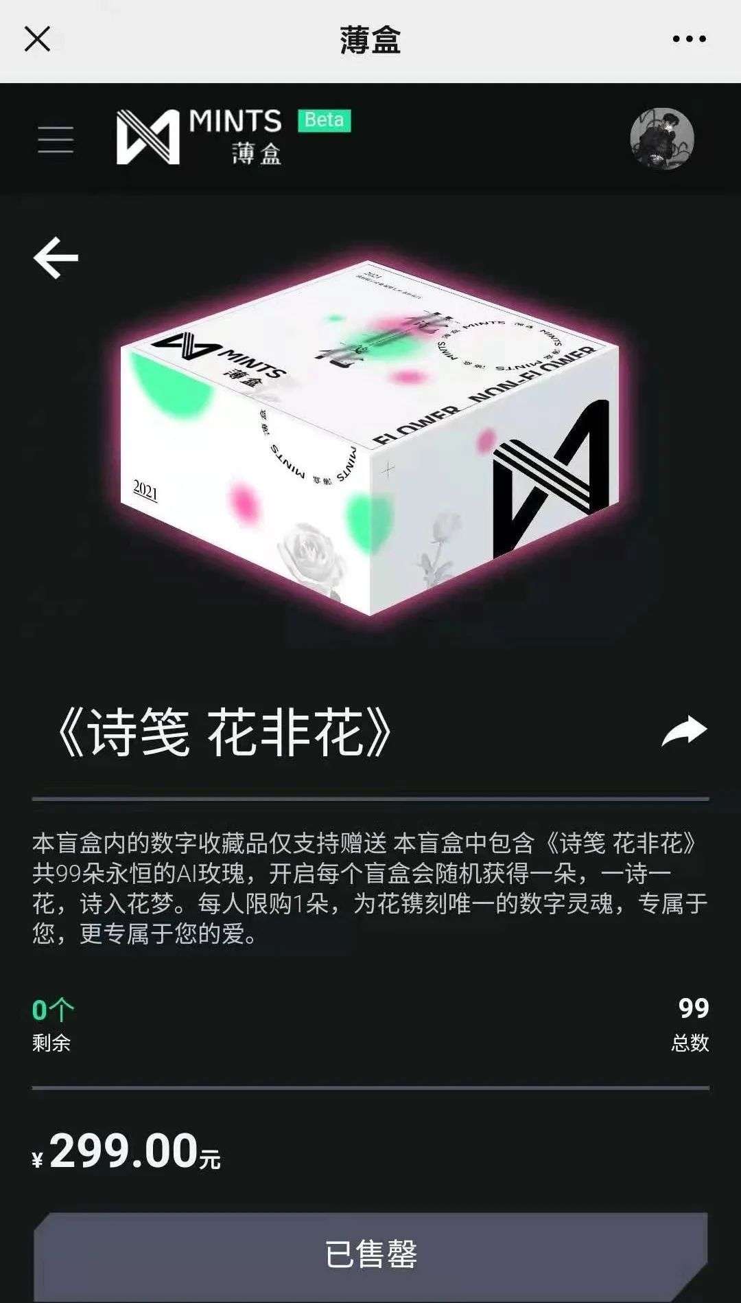 8月13日晚,《诗笺 花非花》盲盒上线20分钟,99份AI玫瑰全部售罄。薄盒的流量并不算高,盲盒受欢迎的原因可能是因为创作者——加密艺术家宋婷。