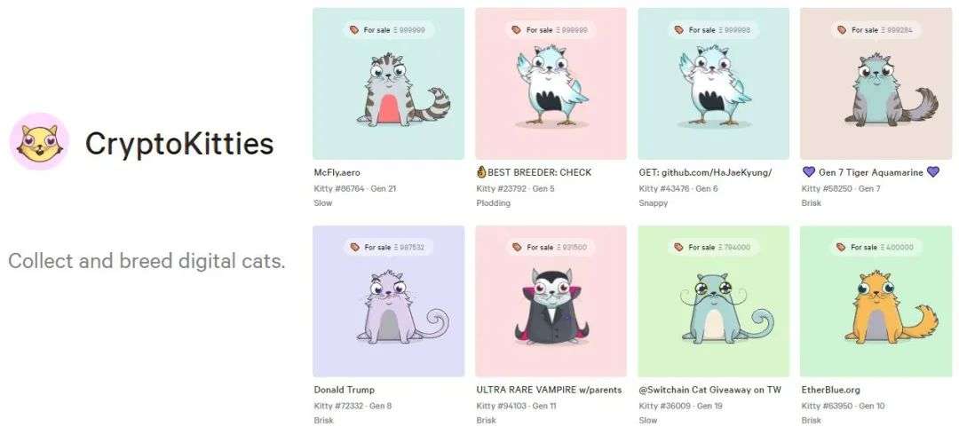 这为NFT的诞生提供了契机。同年,受CryptoPunks影响,一家名为Crypto Cats的公司推出一款名为“密码猫”(CryptocKitties)的游戏,游戏里玩家可以通过一串代码创造出一只“密码猫”数字形象,并且每一只猫都独一无二,这些密码猫们的所有权都被存储在以太坊上。